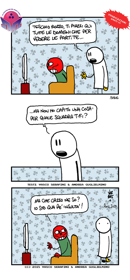 Ormai i vendicazzari sono un piccolo brand. E, sempre in piccolo, da noi si fa tutto quello che si fa nelle vere case editrici. Compresi i Crossover. Non sapete di che parliamo? Evidentemente non siete granché lettori di fumetti, ma vi perdoniamo, perché per essere vendicazzari basta lo spirito e la voglia d’avventura. Avete presente quelle storie epocali dove Superman se le dà di santa ragione con l’Uomo Ragno? O dove Batman si ingegna oltremisura per trovare un modo di sconfiggere Hulk? E poi i due personaggi si alleano per far fronte a un nemico comune? Bene, un incontro “speciale” tra personaggi, come in questo caso, appartenenti a case editrice diverse si definisce appunto ‘crossover’, e nell’ambito dei comics, proprio perché si tratta di occasioni rare, costituisce un evento di grande rilievo. E se la pratica non è nuova ai vendicazzari, che già avevano incrociato gli scudi con il Piccioncinema del valente cartoonist Mauro ‘Manthomex’ Antonini (in costante crescita professionale e tra i membri fondatori del team vendicazzaro), oggi è Vasco Serafini, fumettista web di rilievo grazie alla sua striscia Lo spazzolino del Mago Zurlì, a trascinare i vendicazzari in una nuova avventura intrecciata. Innamoratosi del personaggio del Teschio Rozzo, protagonista di una nostra storica vignetta, ci ha chiesto di poterlo utilizzare come co-protagonista in un trittico di strip tutte da ridere, che trovate a questo link insieme alla vignetta originale. Ergo, siamo orgogliosi di annunciare che (squillo di vuvuzelas)…